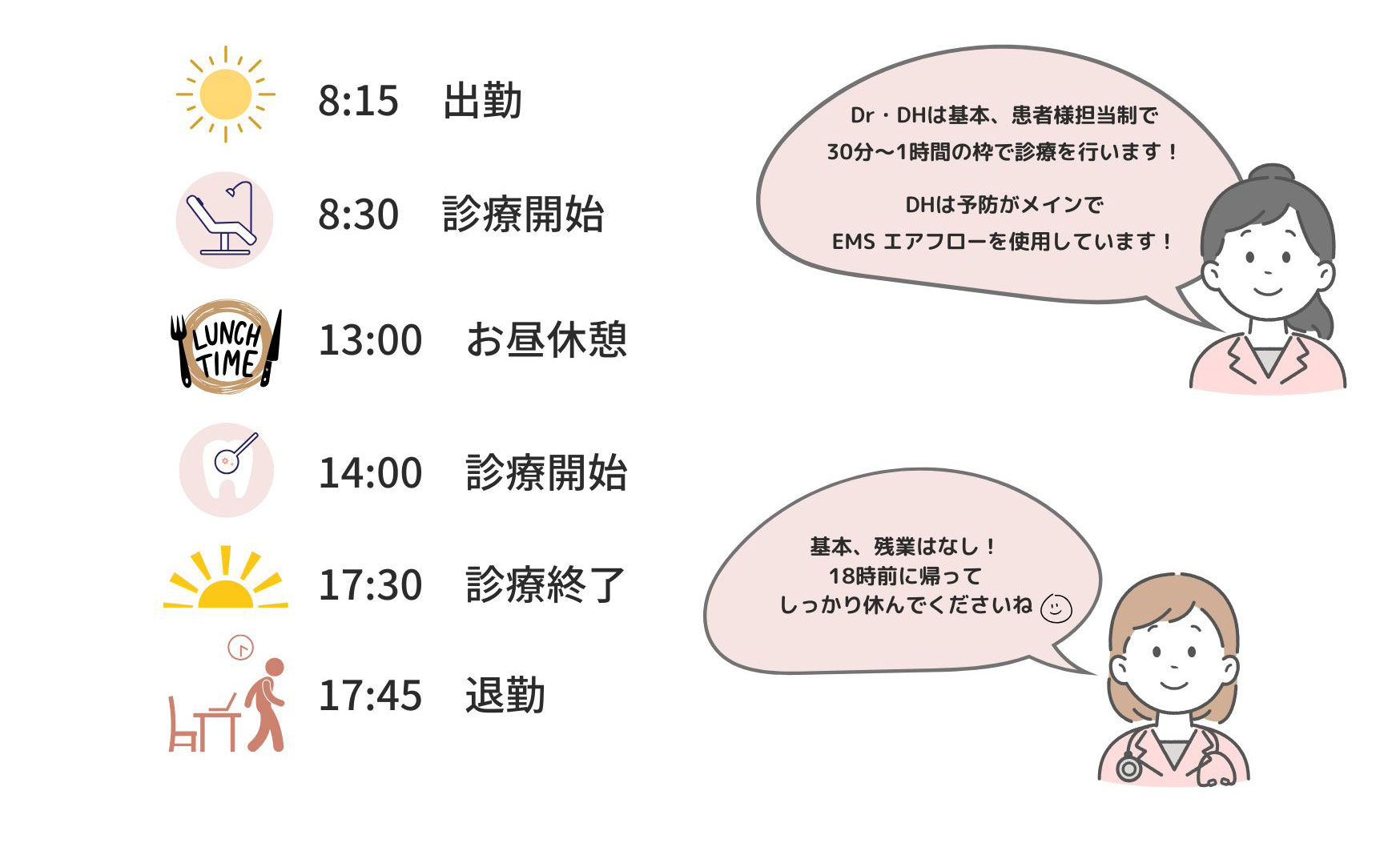 | 就業時間 | 8:15~17:45(昼休憩60分)※診療時間8:30~17:30 |